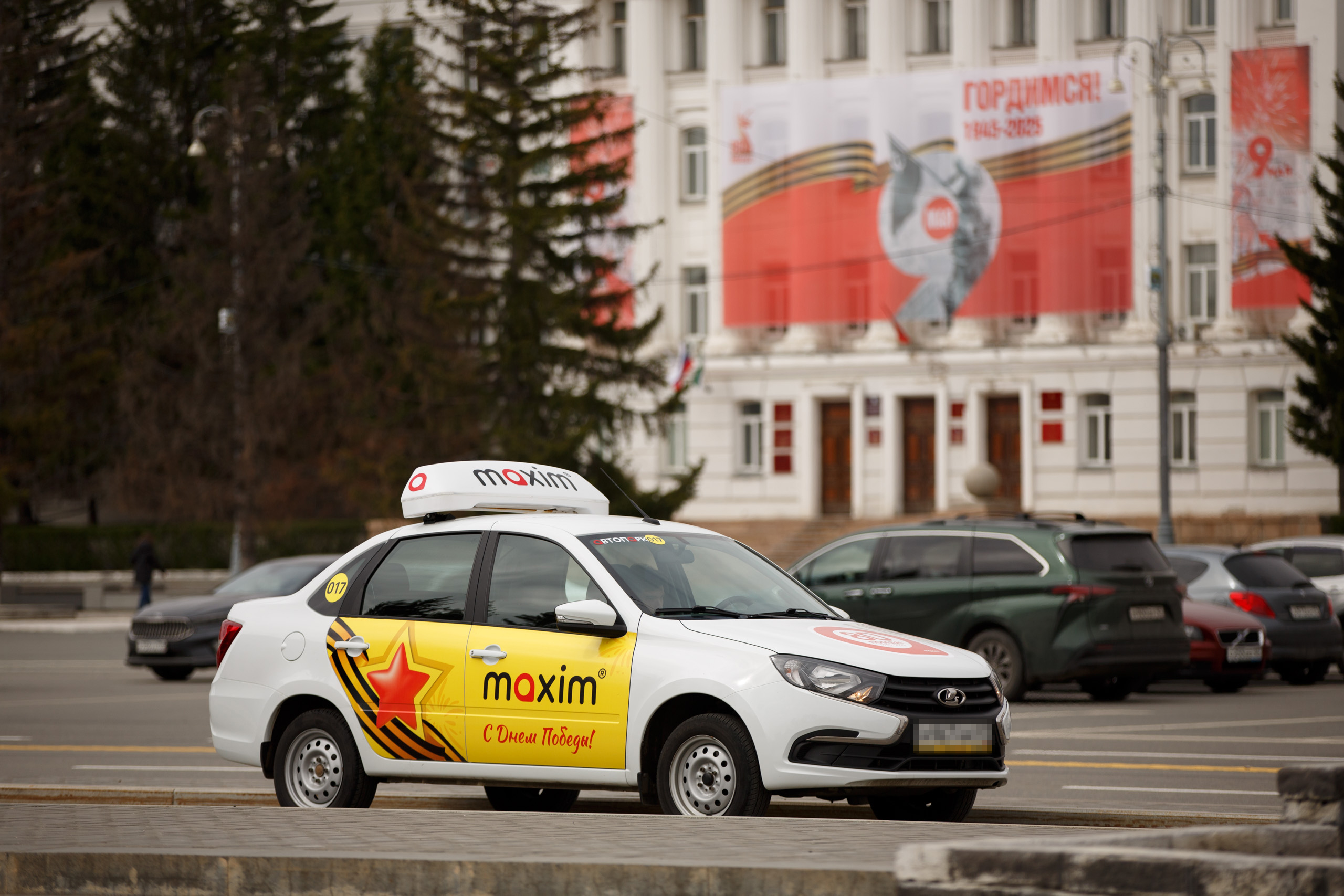 Машины партнёров-перевозчиков сервиса «Максим» украшены геометкой с числом 80, звездой, георгиевской лентой, фотографией ветерана, надписями «С Днём Победы» и «Помним, гордимся!».